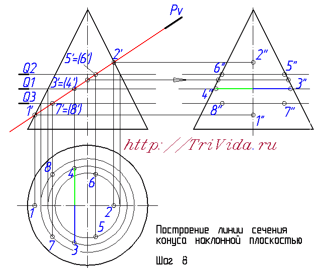 Построение начинаем с горизонтальной проекции прямой правильной призмы потому, что основания призмы параллельны ей и проецируются на нее без искажения: