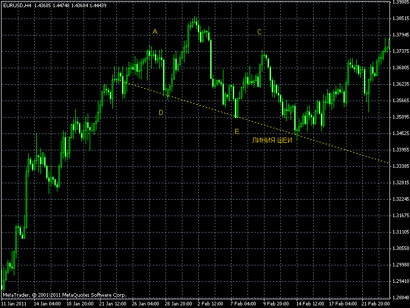 Как правило цена проходит от точки пробоя расстояние не меньше расстояния от вершины головы до линии шеи (H), отмеренного по вертикали.