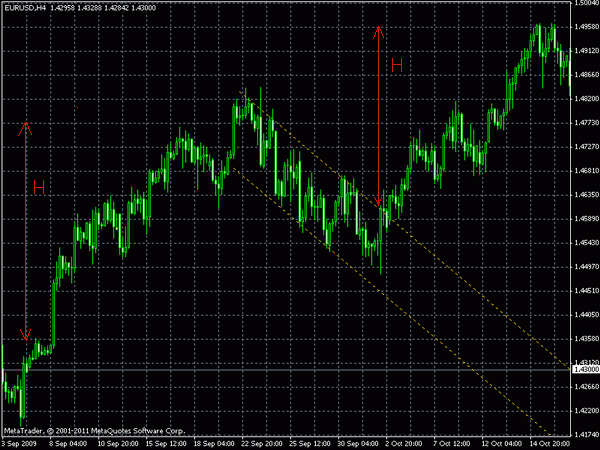 Если треугольник пробивается в направлении текущего тренда, то после пробоя происходит сильное движение и цена уходит не менее чем на высоту треугольника Н (вертикальная высота самой широкой части треугольника).