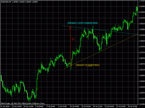 Если же линия сопротивления идет горизонтально, а линия поддержки повышается,