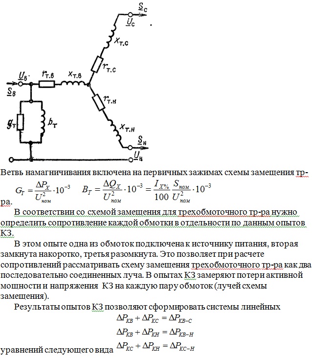 На понижающих п/ст, питающих электрические сети 10 (6) и 35 кВ, устанавливают трехобмоточные трансформаторы с трансформациями 110-220/35/6-10 кВ. Схема замещения трехобмоточного тр-ра одной фазы представляет трехлучевую звезду. Параметры этой схемы – активные и индуктивные сопротивления обмоток ВН, СН, НН – приведены к напряжению первичной обмотки тр-ра.