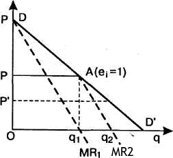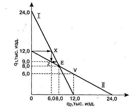 Кривые реагирования можно использовать для того, чтобы-показать, как устанавливается равновесие. Если следовать стрелкам, нарисованным от одной кривой к другой, начиная с выпуска q1 = 12 000, то это приведет к осуществлению равновесия Курно в точке Е, в которой каждая фирма производит 8000 изделий. В точке Е пересекаются две кривые реагирования. Это и есть равновесие Курно.